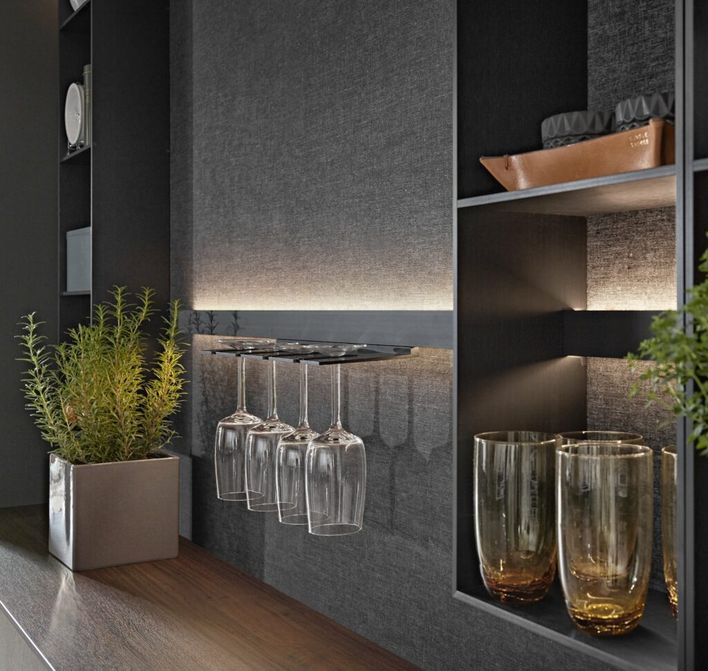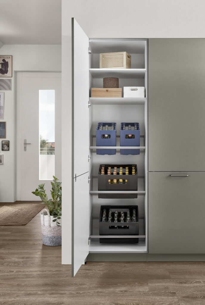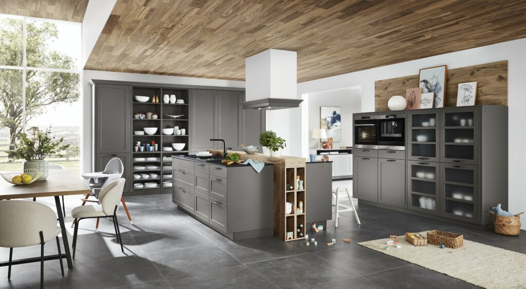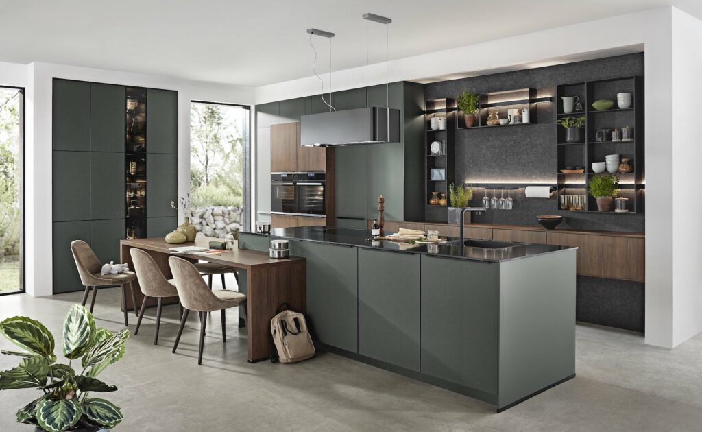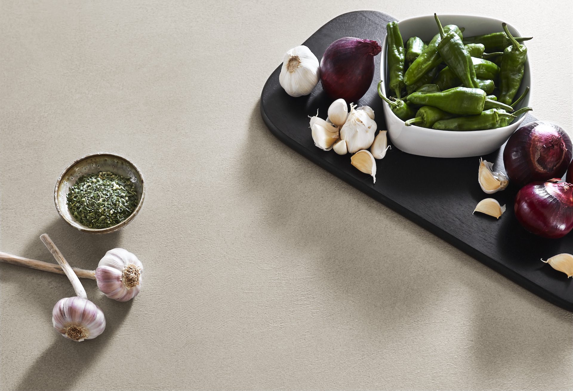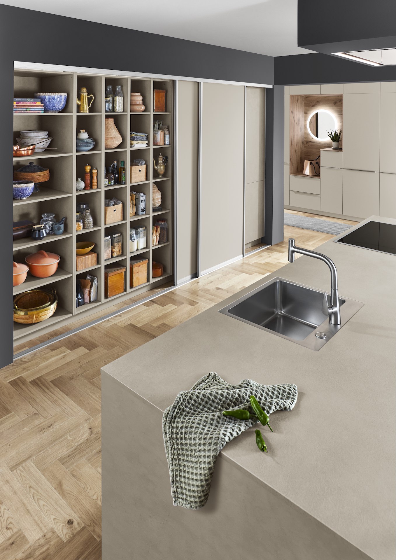 Eine Planung, die auf Ganzheitlichkeit setzt. Die neue Beton-Nuance Sand der Küchenfronten und die großformatigen Gleittüren im Farbton Sand harmonieren perfekt. Auch zum Dekor der Arbeitsplatte mit echter Keramikoberfläche.