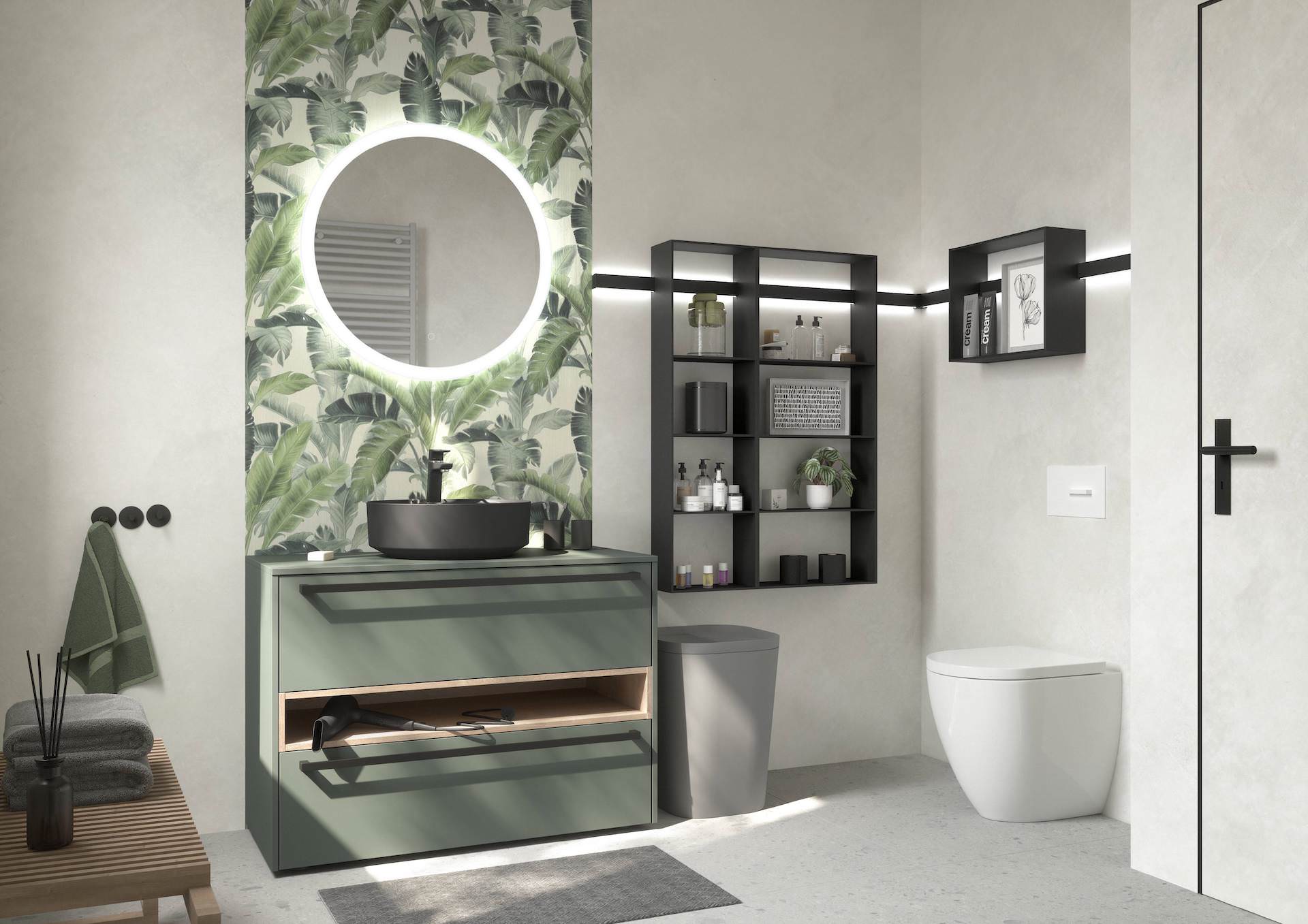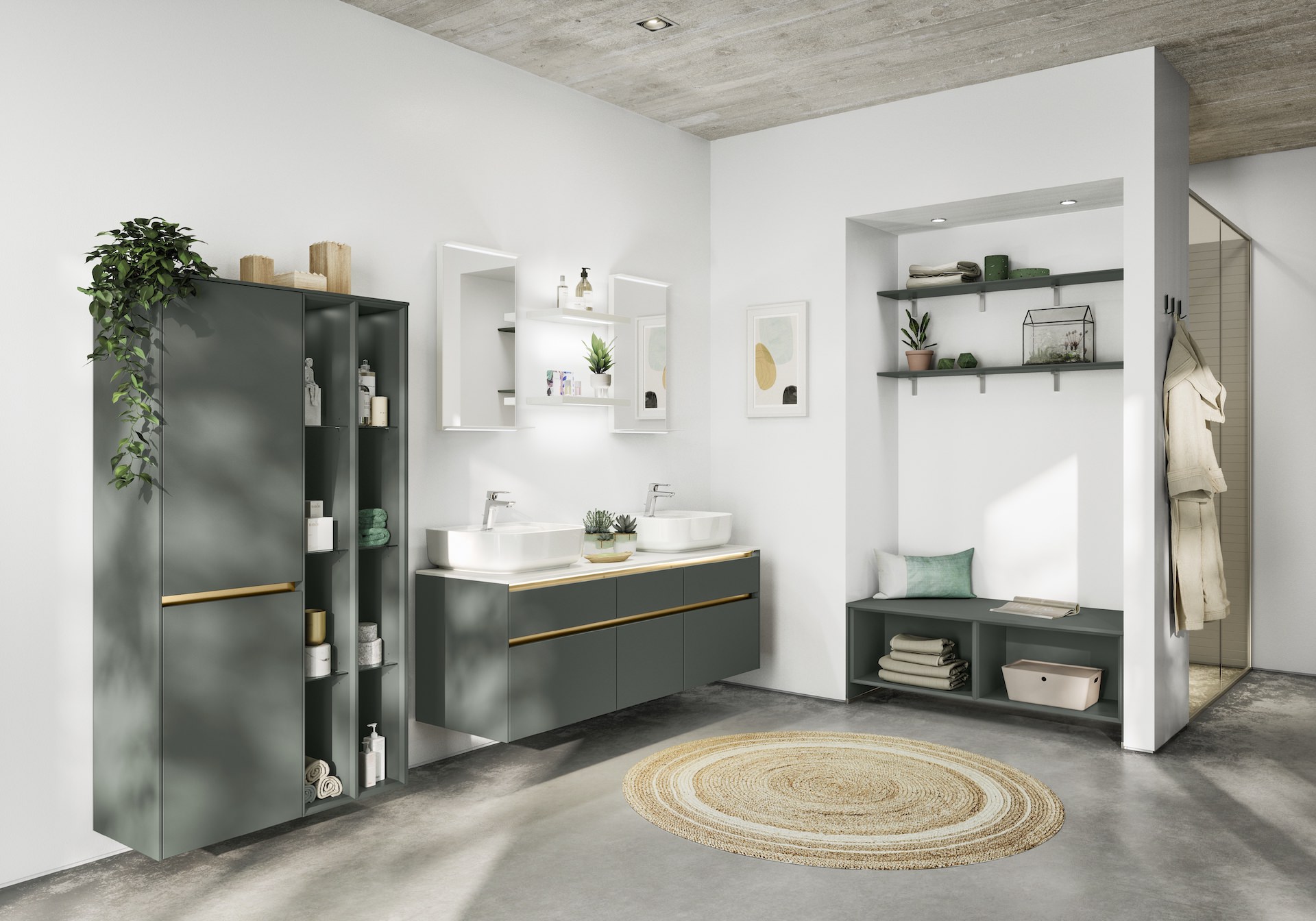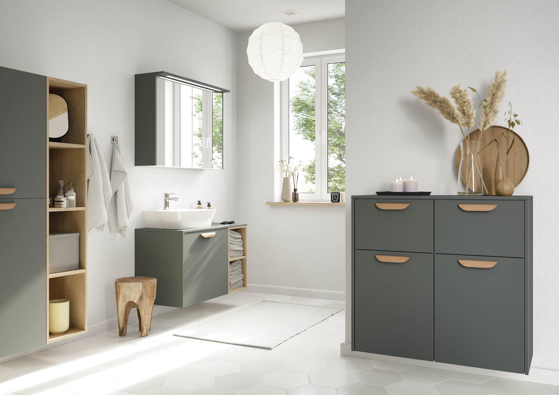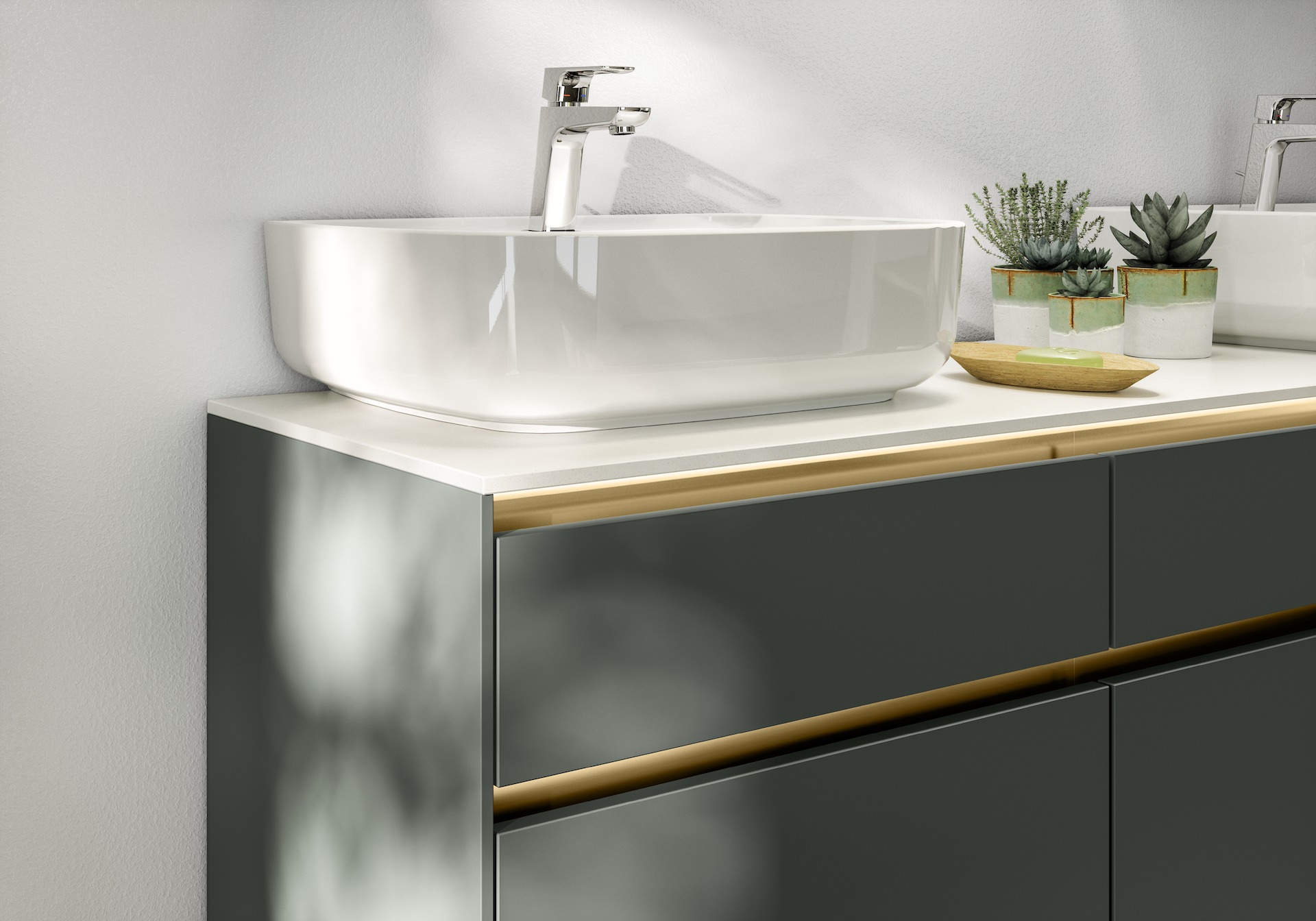 Mineralgrün ist ein erfrischender Farbton für Ihr Badezimmer, der eine beruhigende Atmosphäre schafft. Unsere mineralgrünen Fronten mit Anti-Fingerprint-Beschichtung bieten eine praktische und gleichzeitig stilvolle Lösung für Ihr Badezimmer. Die goldenen Griffleisten geben den Möbeln einen eleganten Touch und sorgen für einen zeitgemäßen Look.