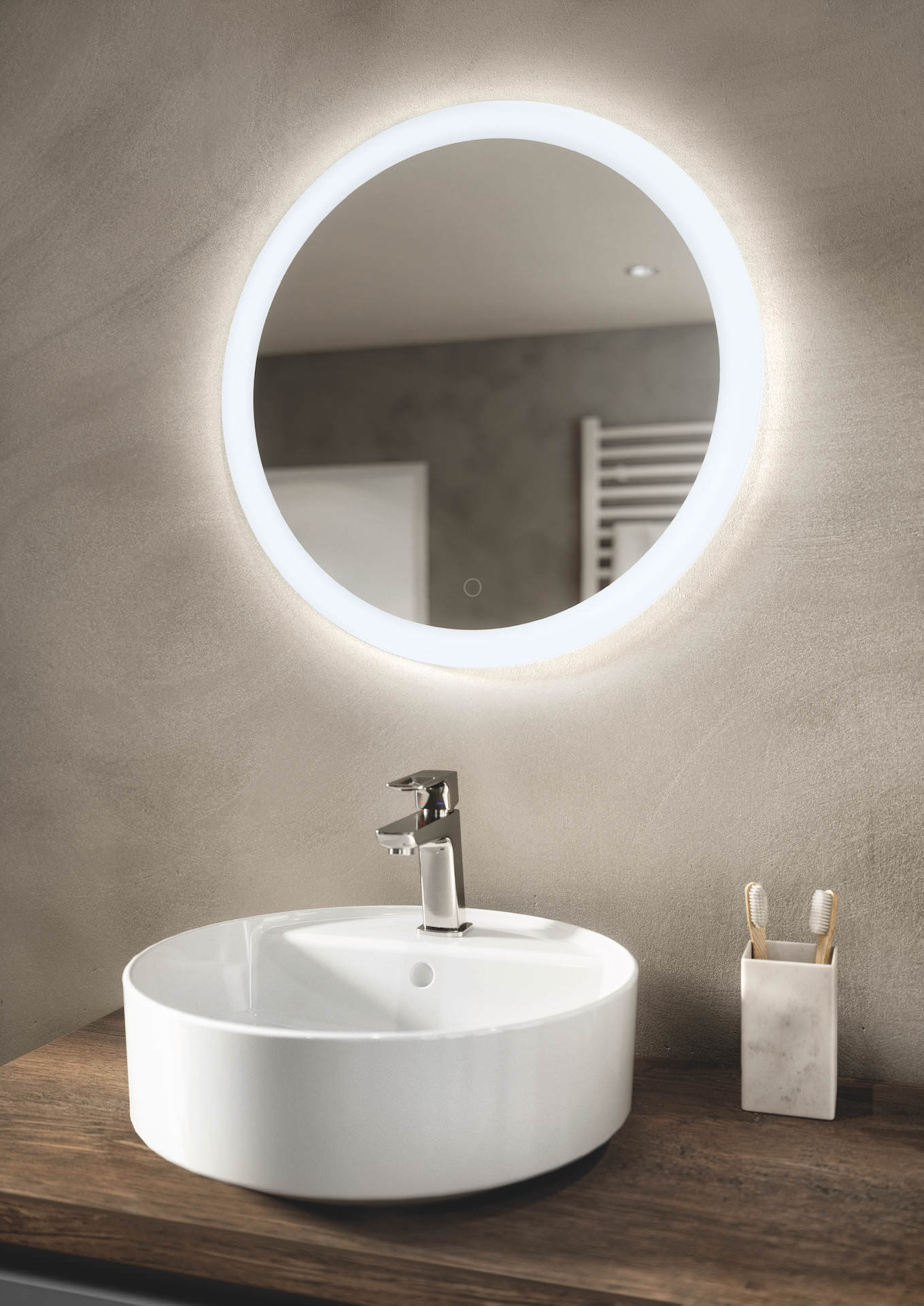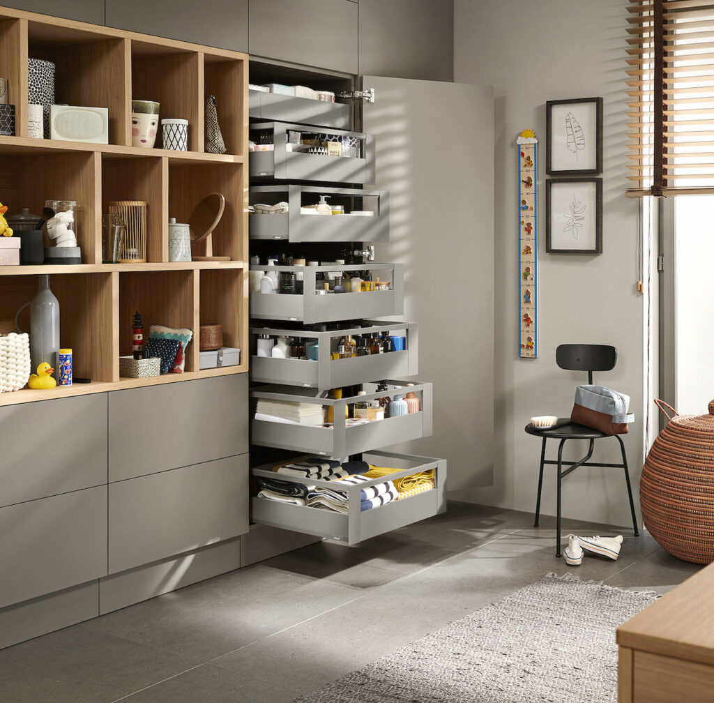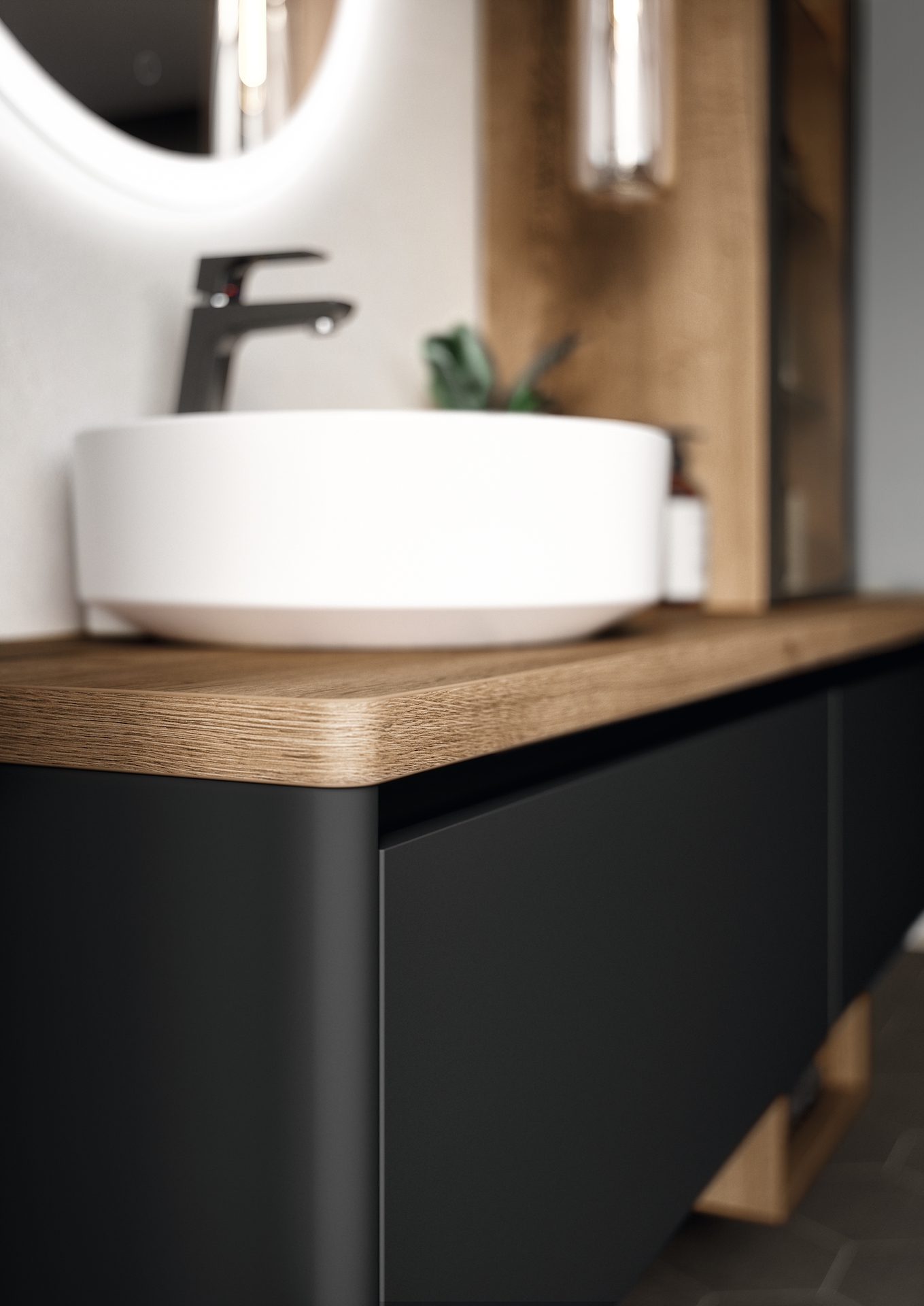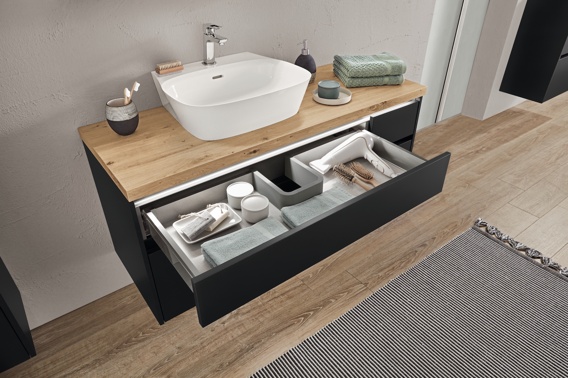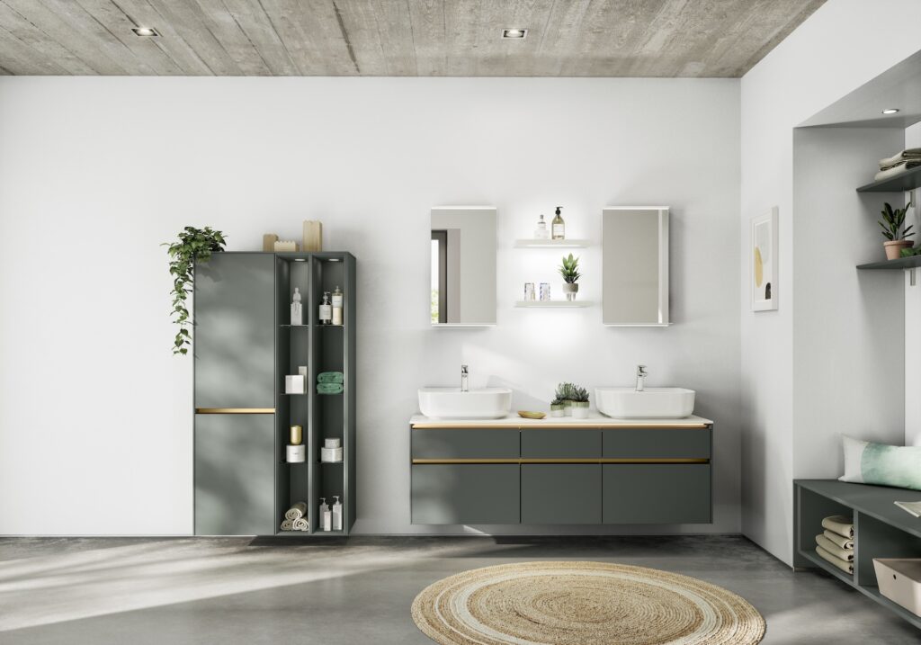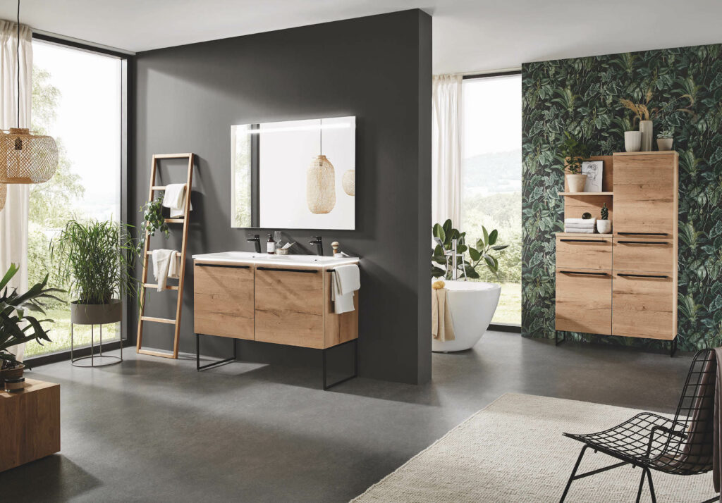 Mit der kraftvollen Kombination von Mattschwarz und Stammeiche Nachbildung betonen Sie die moderne Formensprache der frei kombinierbaren Elemente. Ergebnis: eine spannende Linienführung. Schwarzmatt ist eine zeitlose Farbe für Ihr Badezimmer, die einen Hauch von Eleganz und Raffinesse verleiht. Unsere schwarzen Badmöbel sind nicht nur stilvoll, sondern auch äußerst langlebig und funktional. Die matten Oberflächen schaffen einen schönen Kontrast zum Vitrinenschrank Flat mit ultraschmalem Aluminiumrahmen. Der Vitrinenschrank bietet ausreichend Stauraum für Ihre Badutensilien und sorgt für eine zusätzliche Note an Raffinesse in Ihrem Badezimmer.
