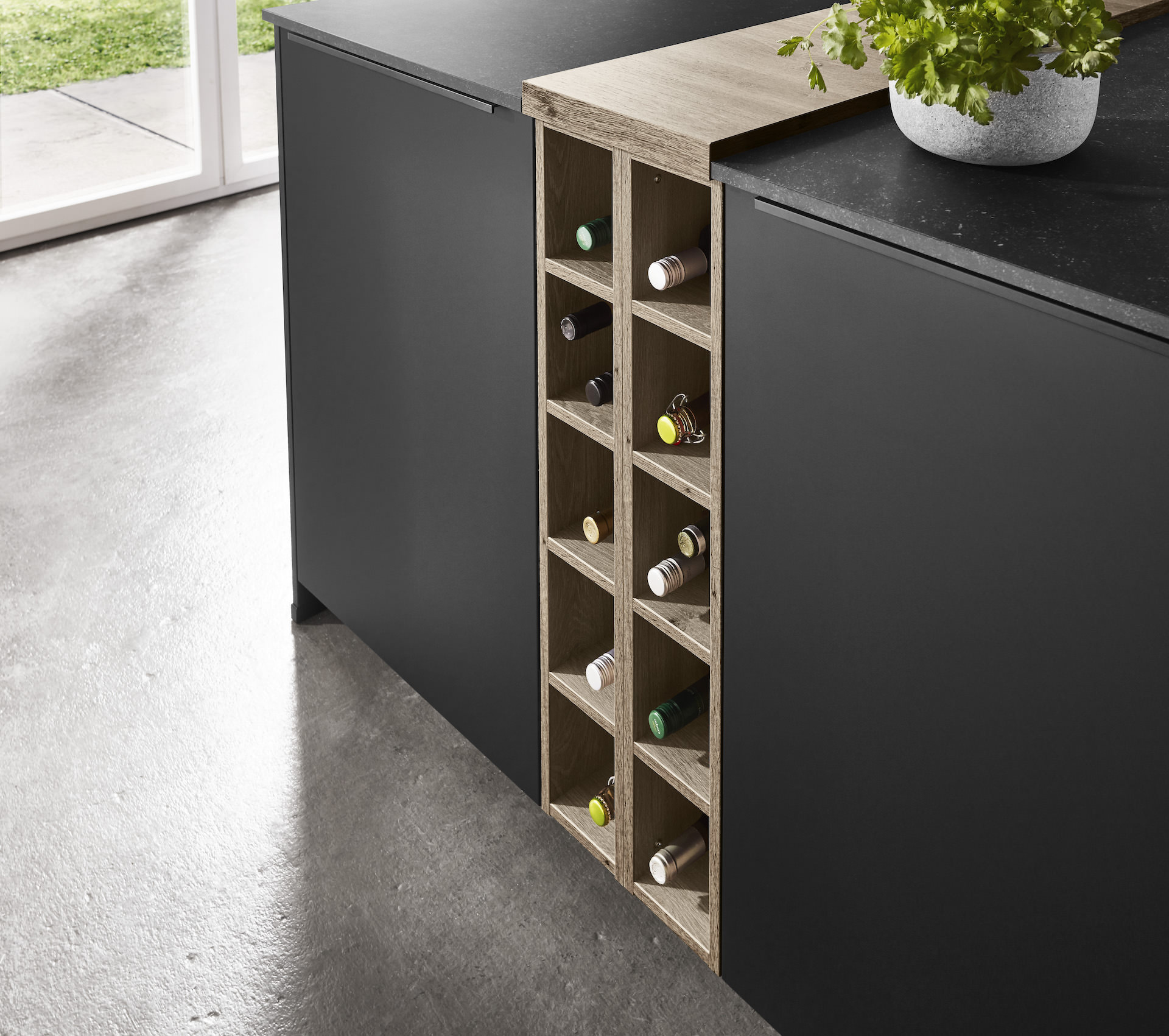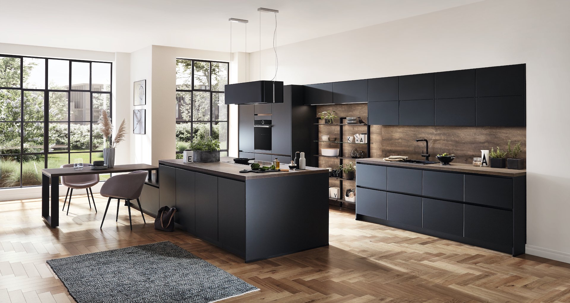 Perfekt für Ästheten, die sich gerne auf das Wesentliche konzentrieren. Hier sprechen Form und Ästhetik für sich. Details machen den Unterschied. Schöner Blickfang im Designer-Look sind die geradlinigen, schwarzen Tischkufen, die einen optischen Rahmen im gesamten Küchenbereich schaffen.