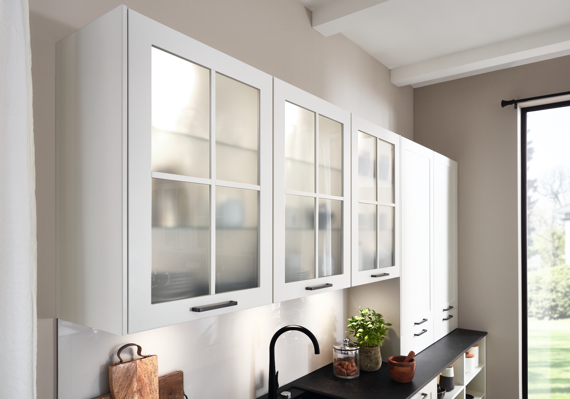 Eine moderne Landhausküche, die viel bietet: beispielsweise Gusseisengriffe, geradlinige Sprossentüren mit Glaseinlagen, innovative Beleuchtung und hohe Aufsatzschränke. Eine neue, schnörkellose Wohnlichkeit.